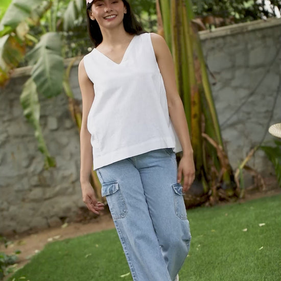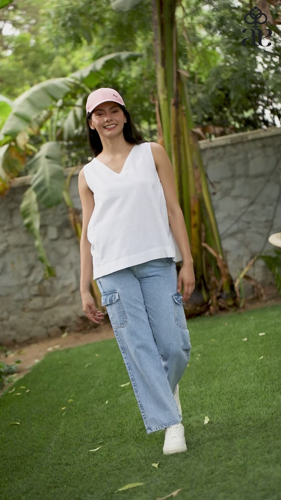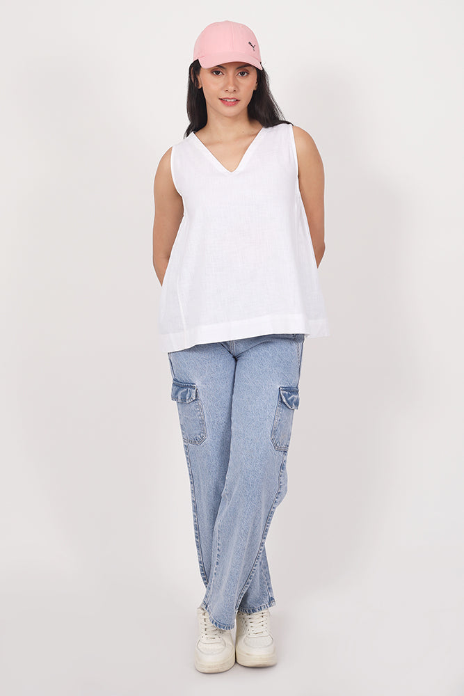 Aimi Top, where minimalist charm meets everyday ease. Cut in a breathable, lightweight Linen cotton, this sleeveless white top is designed with a flattering V-neck,elasticated detailing under the arm and a relaxed silhouette that pairs effortlessly with jeans, trousers, or skirts.
