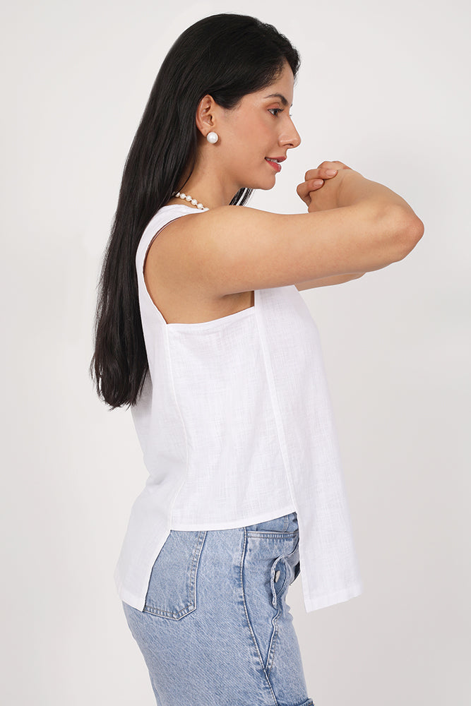 A statement in simplicity, the Akie Top is crafted for warm-weather ease with an elevated twist. Designed in breathable cotton-linen, its sleeveless silhouette is enhanced with a clean overlay panel that adds modern structure.